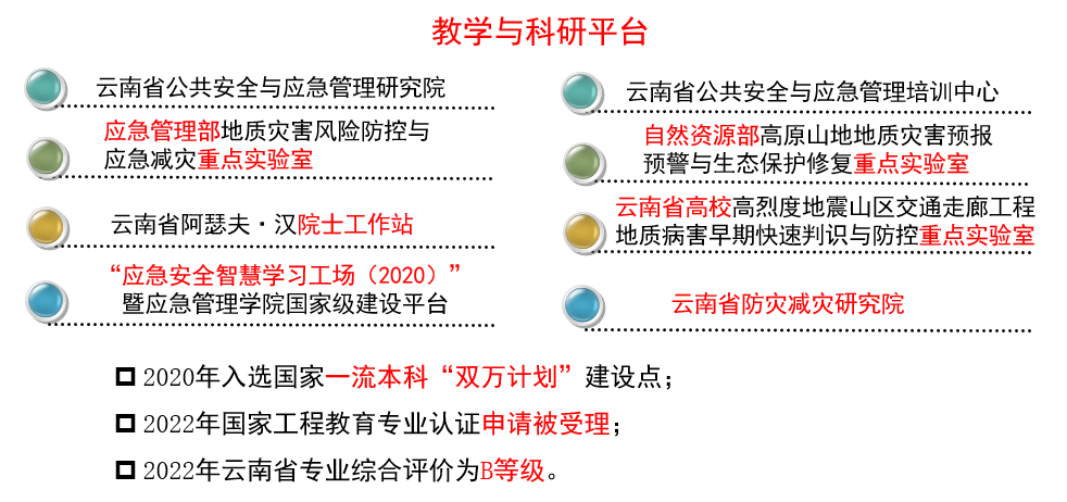 学院现有安全工程1个国家级一流本科专业,该专业于2002年招收首届本科生,2004年开始招收硕士研究生,2011年获安全科学与工程一级学科硕士学位授予权,现已建成安全科学与工程一级学科学位硕士授权点、云南省省级立项建设一级学科博士学位授权点,在全国第五轮学科评估中被评为C-等级,2020年入选国家一流本科“双万计划”建设点,2023年通过了全国工程教育专业认证,在云南省专业综合评价中被评为B-等级。目前,学院具有“云南省公共安全与应急管理研究院”与“云南省公共安全与应急管理培训中心”两个省级平台,同时具有云南省防灾减灾研究院、应急管理部地质灾害风险防控与应急减灾应急管理部重点实验室、自然资源部高原山地地质灾害预报预警与生态保护修复重点实验室、云南省阿瑟夫·汉院士工作站、云南省土木工程防灾重点实验室、云南省高校高烈度地震山区交通走廊工程地质病害早期快速判识与防控重点实验室等多个省部级科研与教学支撑平台,且获批了国家首批“应急安全智慧学习工场(2020)”暨应急管理学院国家级建设平台(首批19所,西部唯一)。黑料正能量