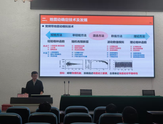 傅磊博士从抗震设防地震动的研究背景与现状、关键技术发展、工程实践应用三个层面系统展开讲解。他结合我国地震环境特征与重大工程分布实际,重点介绍了宽频带地震动模拟的五类主要技术方法,并对比分析了各类方法的适用条件与技术优势。傅磊博士还结合地震灾害三级防控体系、全国地震动参数区划、区域抗震防灾规划等典型案例,阐述了设防地震动在提升工程抗震韧性与城市安全水平中的关键作用。在交流环节,师生围绕地震动参数确定及强震动观测数据在工程中的应用等问题,与傅磊博士进行了深入探讨。